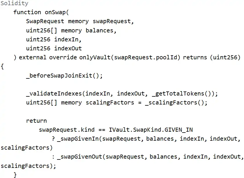 攻擊的入口為Balancer: Vault 合約,對應的入口函數為 batchSwap 函數,內部呼叫 onSwap 做代幣兌換。