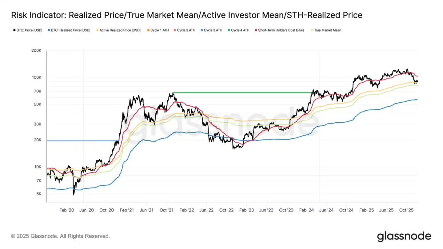 比特幣仍處於結構性脆弱的區間內,受到未實現損失增加、已實現損失較高以及長期持有者大量獲利了結的壓力。儘管如此,需求將價格錨定在真實市場均值之上。
