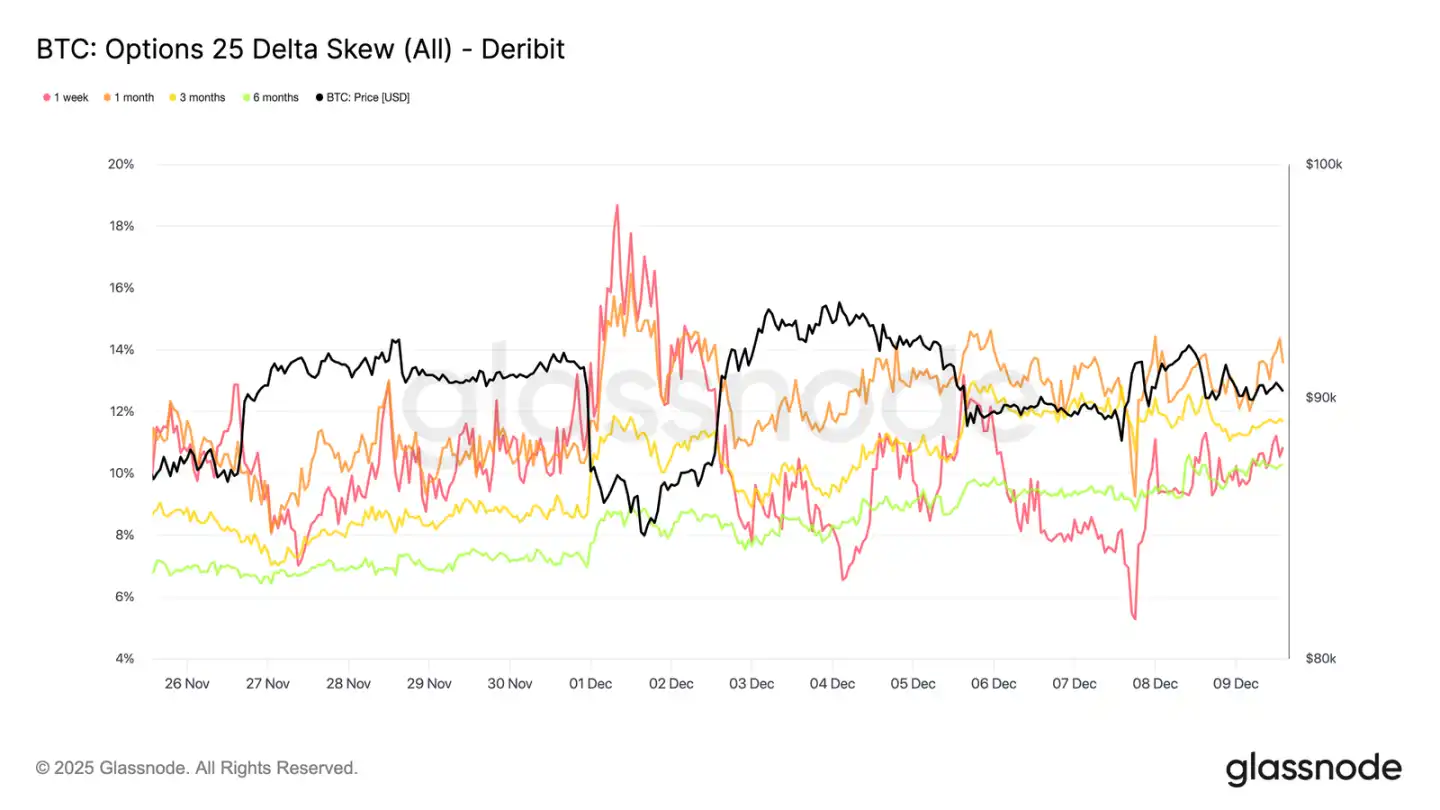 偏度在各期限上保持緊密聚集,範圍在10.3% 到13.6% 之間。這種壓縮表明,對看跌保護的偏好是全曲線範圍內的,反映了一種一致的避險傾向,而非僅限於短期端的孤立壓力。