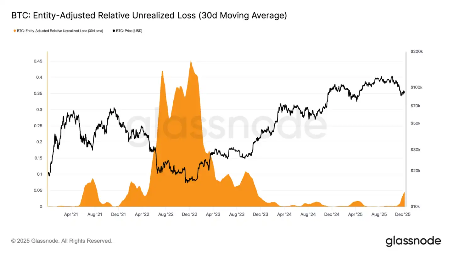 相對未實現損失(30 日簡單移動平均線)已攀升至4.4%,此前近兩年均低於2%,標誌著市場從狂熱階段轉向了壓力和不確定性加劇的階段。這種猶豫不決目前定義了該價格區間,解決此問題需要新一輪的流動性和需求以重建信心。