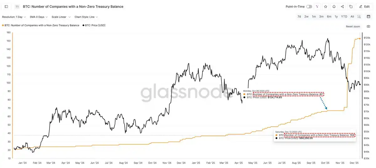 這裡要注意的是,在10 月6 日的時候,持有「BTC 非零餘額」的企業還僅僅只有67 家,而隨著BTC 的深度回調,該數量突然激增,目前已經有153 家了。這是否意味著,在價格下行過程中,有新的企業級玩家正在悄悄入場?
