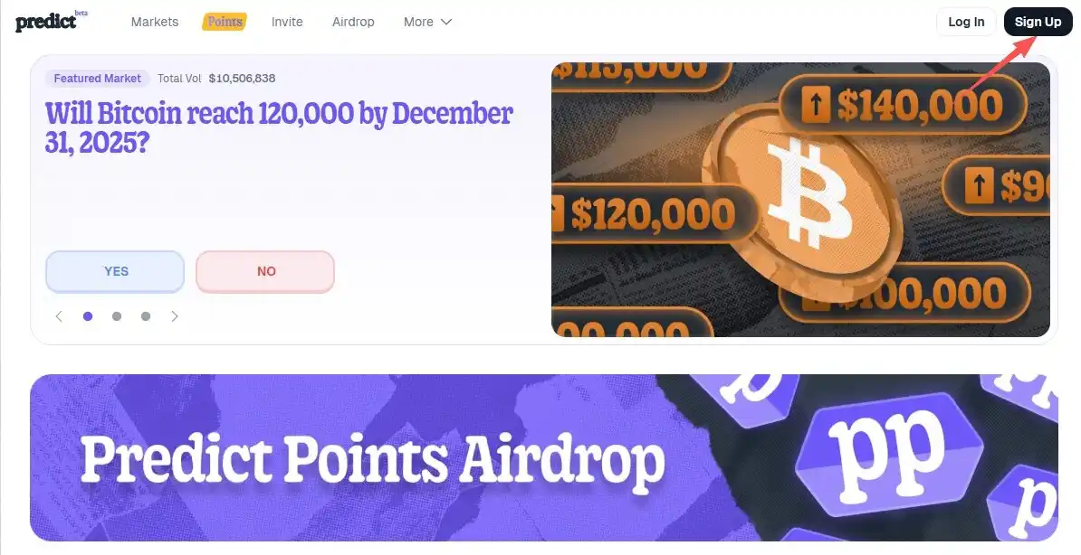 STEP 1. After logging into the project's official website (link: https://predict.fun/), click "Sign Up" on the first visit to register an account and log in.