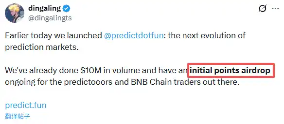 On December 17, the founder of the prediction market platform predict.fun, dingaling, posted on Platform X announcing that the platform is officially open. They airdropped initial points to Meme traders on the BNB Chain, Aster participants, and active users in various prediction markets.