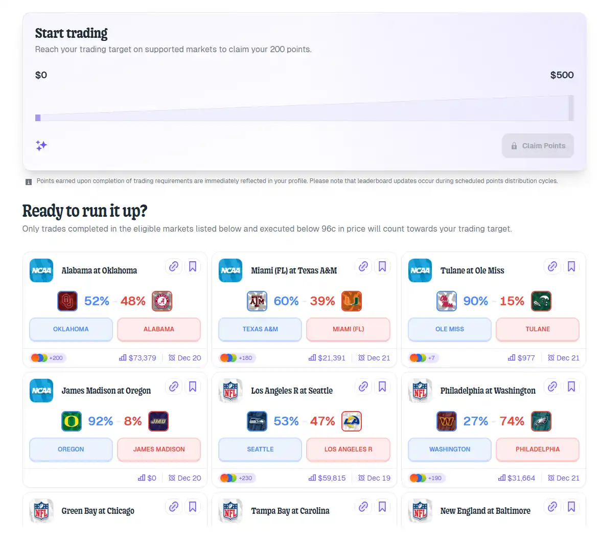 步骤 6:通过在平台交易解锁个人积分,如图所示展示账号需完成 500 美元交易量来解锁 200 积分。需要注意的是,只有参与事件下注才算有效交易。