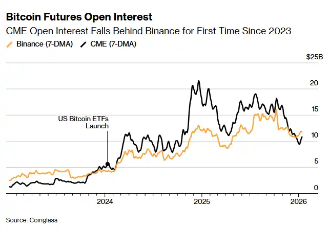 機構常用的「現金與套利」(cash-and-carry)交易,即購入比特幣現貨、同時沽空期貨以賺取價差,正朝向崩潰的方向前進。這不僅預示著套利空間被迅速擠壓,也釋放出更深層的訊號:加密市場的結構正在發生變化。芝加哥商品交易所(CME)的比特幣期貨未平倉合約(open interest)自 2023 年以來首次跌破幣安,進一步說明隨著價差收窄、市場準入更高效,過去那種利潤豐厚的套利機會正被迅速侵蝕。
