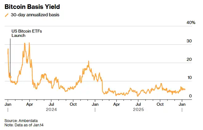 根據 Amberdata 匯總的數據,目前一個月期限的年化收益率徘徊在約 5% 左右,處於近年來的低位。Amberdata 衍生品主管 Greg Magadini 表示,就在一年前的這個時候,基差還接近 17%,而如今已降至約 4.7%,幾乎只夠勉強覆蓋資金成本和執行成本的門檻。與此同時,一年期美債收益率約為 3.5%,使得這筆交易的吸引力正在迅速消退。