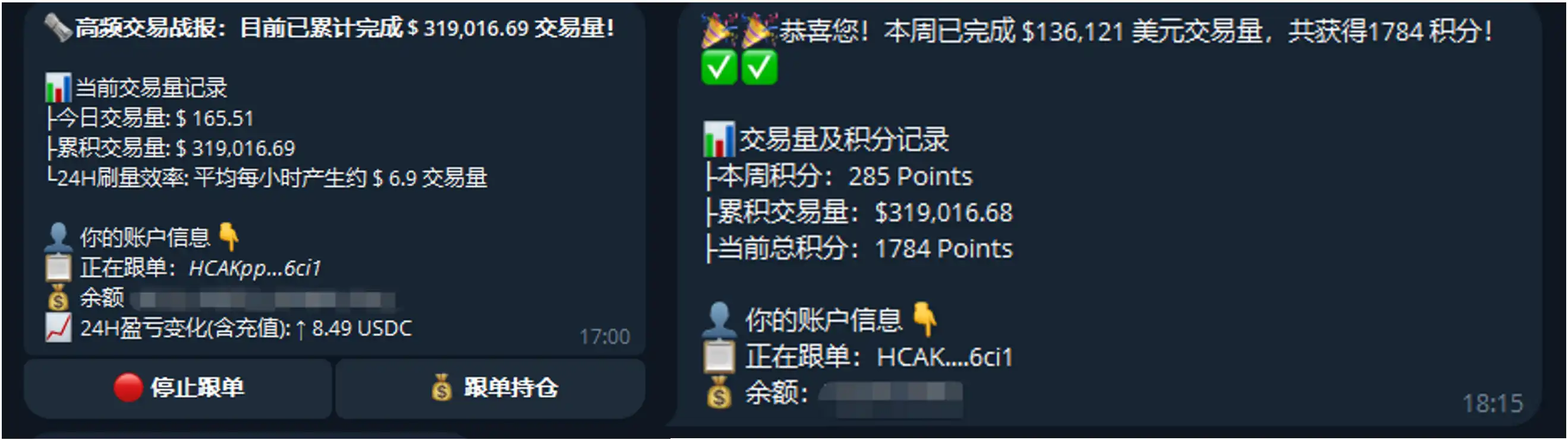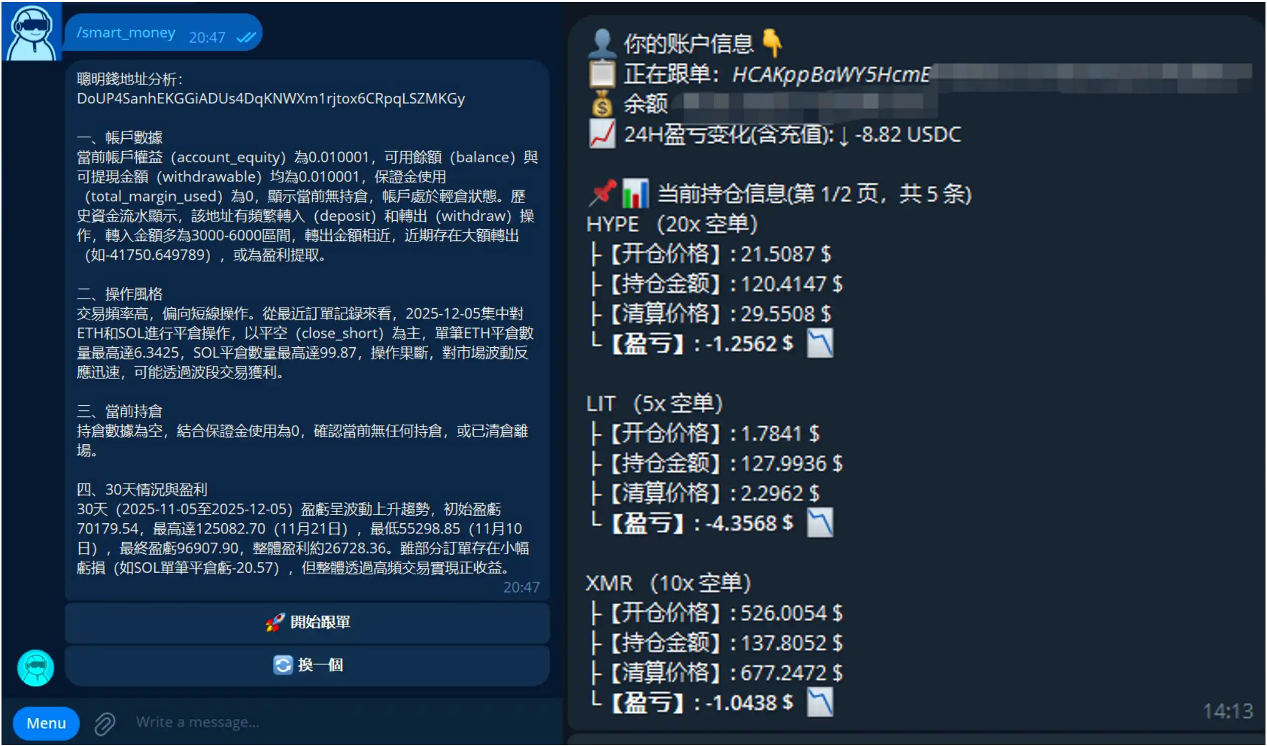 這款 Bot 也給推薦了一些合適的跟單地址,不過筆者也很機智地選擇了跟單自己的地址,這樣既可以控制交易磨損和交易策略,還能同時進行兩個帳戶積分。