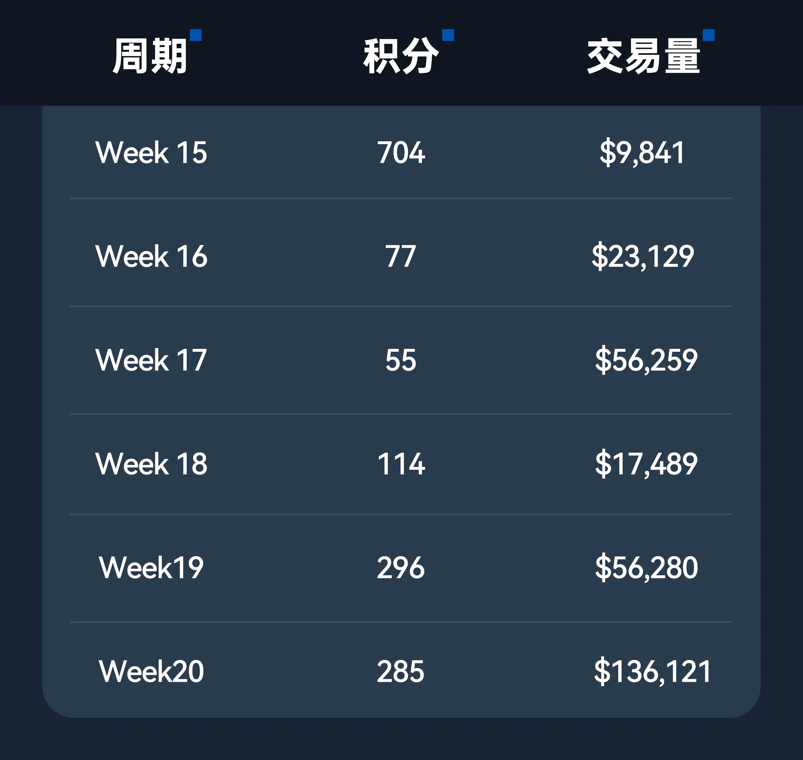 大約在 12 月底才開始進行交易,而由於剛開始交易的第一周(Week15)就碰到大波動行情,因此爆倉了兩次,不過值得注意的是,當周交易量僅有 9000 美元的情況下,卻拿到了 700 多積分,也是筆者在開始交易後拿到積分最多的一周。