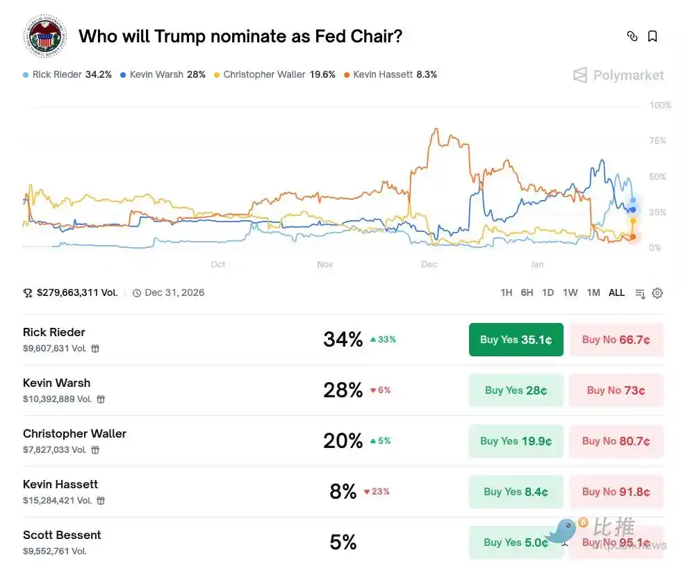 根據 Polymarket 最新數據,在「特朗普將提名誰擔任美聯儲主席」的押注中,幾位候選人的勝率已經拉開距離: