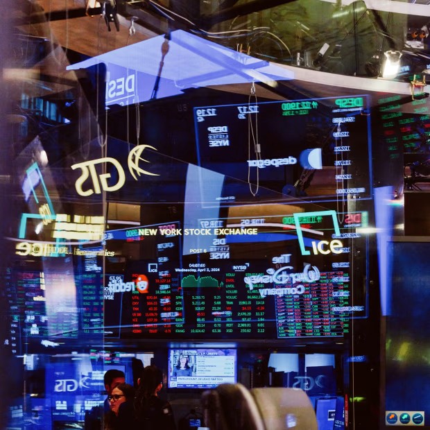 紐約證券交易所大樓內玻璃反射出行情與市場數據
