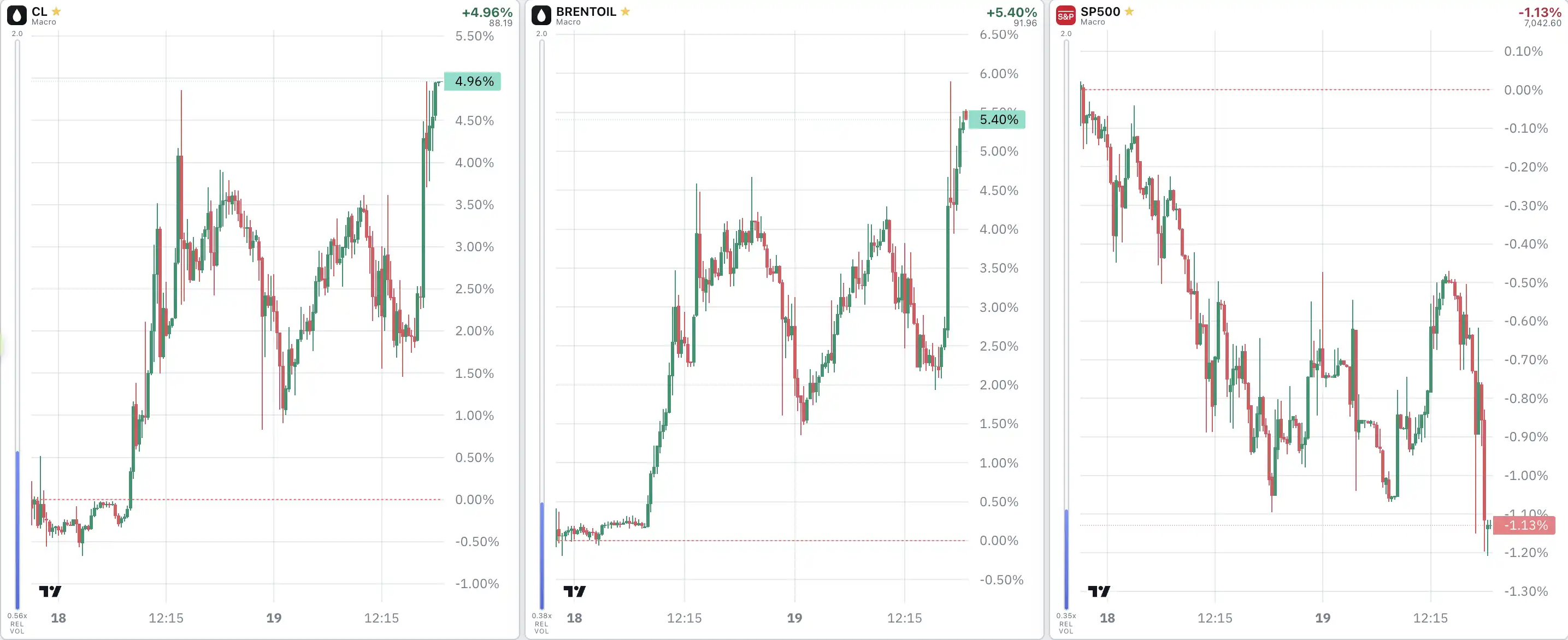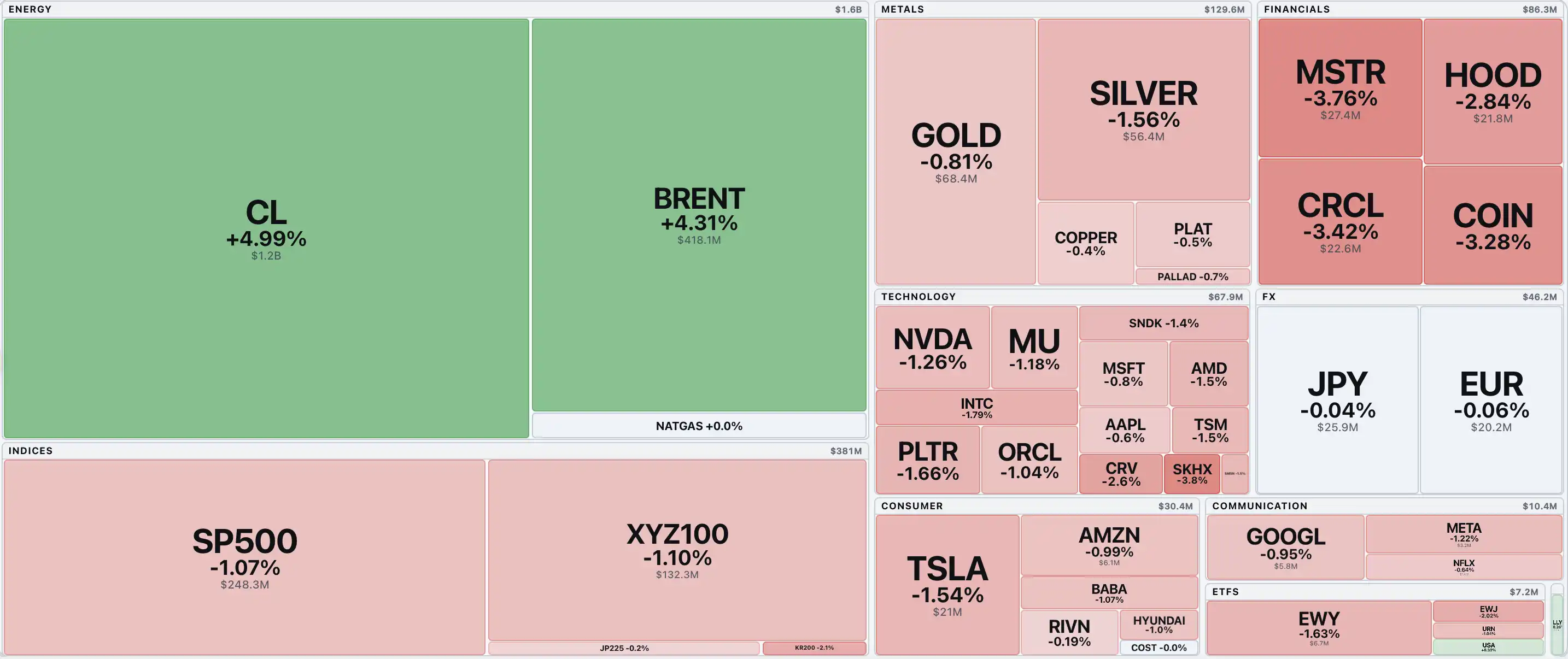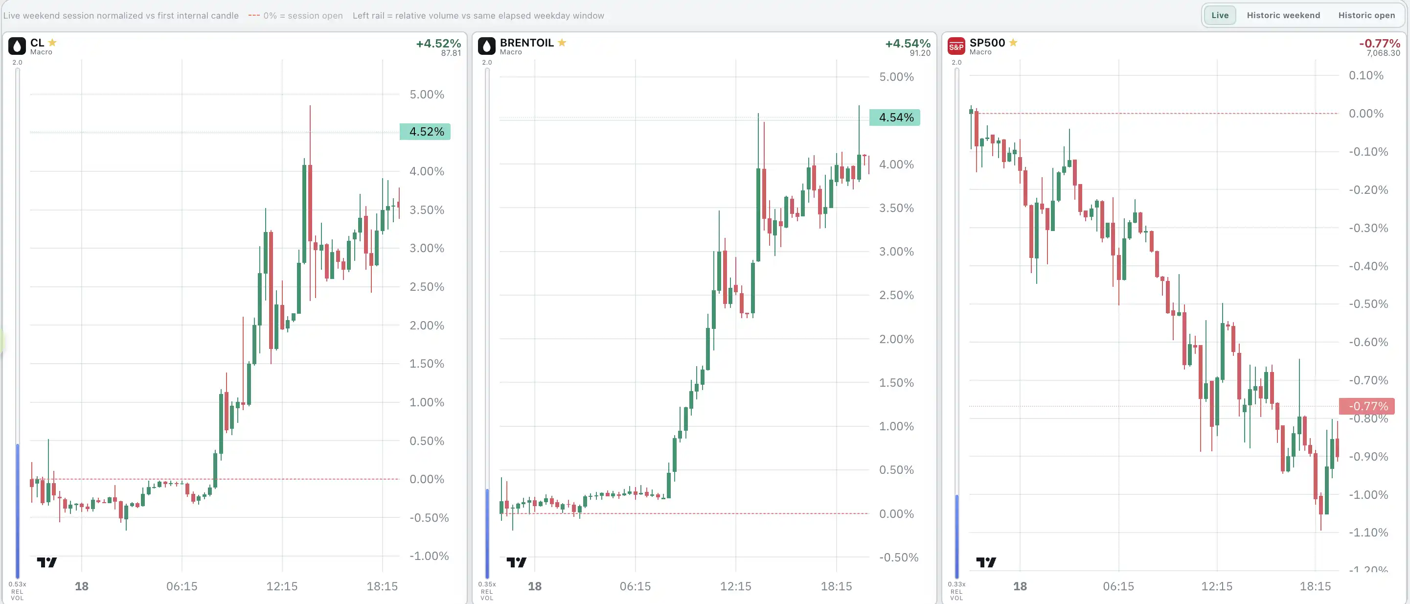 交易員在 TradeXYZ 上迅速反應,原油合約相比周末收盤價漲幅約 4.52%,標普指數合約下跌近 0.8%。