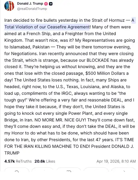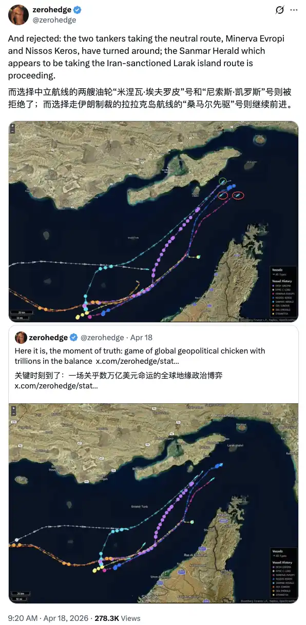 18 日(週六)上午 9 點 20 分,兩艘油輪在霍爾木茲海峽遭拒絕通行的報導率先打破平靜。特朗普隨即公開施壓:若週三前未達成協議,美方將繼續封鎖伊朗港口。當日 16 點,伊朗宣布對海峽重新實施限制,並向試圖通過的船只開火——兩艘印度船只在遭砲擊後掉頭返回波斯灣,海峽航運幾近停滯。