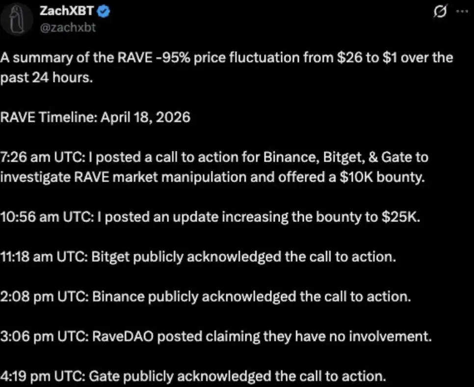 2026 年 4 月,在 RAVE 代幣暴漲 4500% 之後不久,鏈上調查員 ZachXBT 公開指控其存在操縱行為。