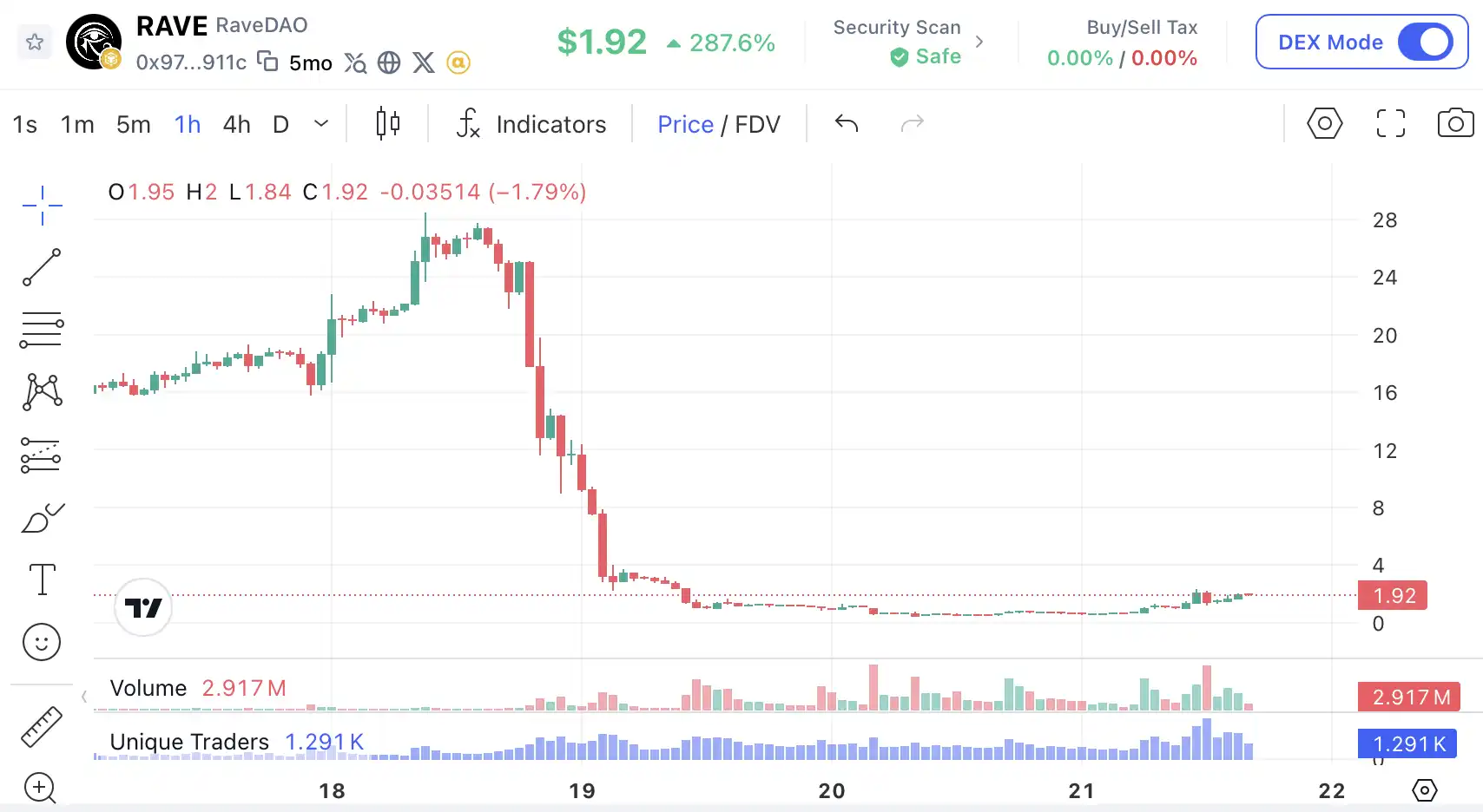 隨後,Binance 與 Bitget 啟動調查,$RAVE 價格從 26 美元暴跌至 1 美元,跌幅達 90%,單日蒸發約 57 億美元市值。RaveDAO 隨後回應,否認團隊參與其中。