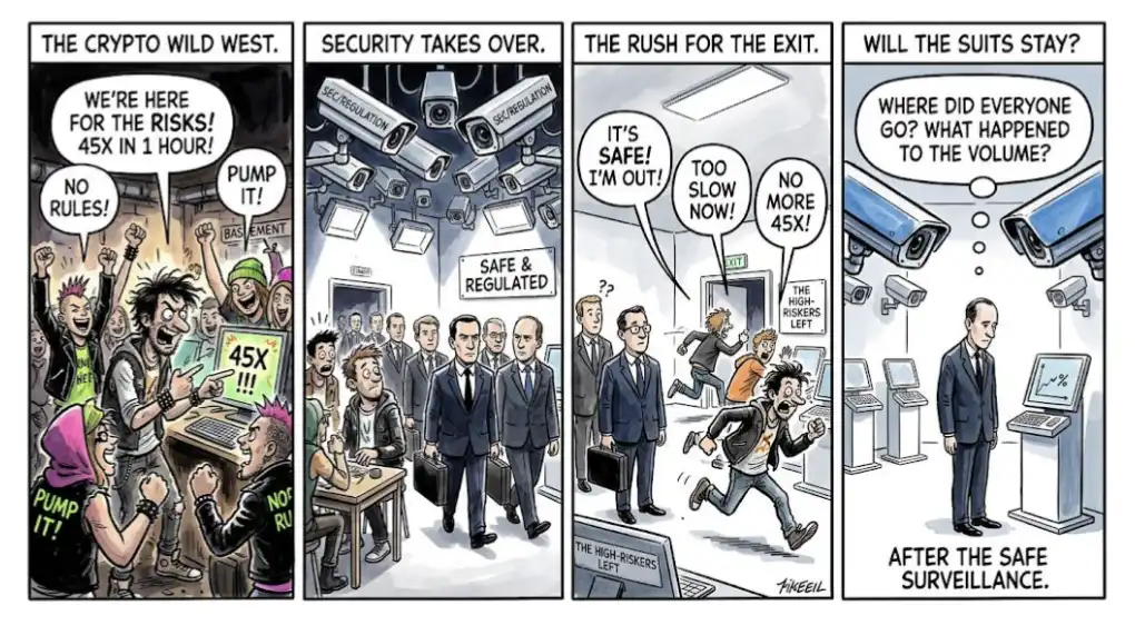 設想這樣一個加密市場:類似美國證券交易委員會的監管全面介入——團隊錢包完全披露,供應高度集中的項目在上市前就被篩掉,流動性操縱被實時監測。在這樣的市場裡,還有哪個項目能夠激發散戶的「腎上腺素」?那已經不再是加密市場,而更像一個緩慢運轉的股票市場。