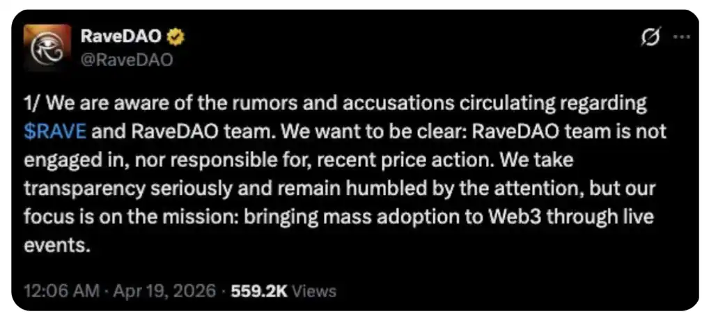 這是一條來自 RaveDAO 的聲明。項目方表示已注意到圍繞 $RAVE 和團隊的各種傳言與指控,並明確否認參與或對近期價格波動負責。同時強調他們重視透明度,對關注表示謙卑,但當前重點仍是推進其使命——通過線下活動推動 Web3 的大規模採用。