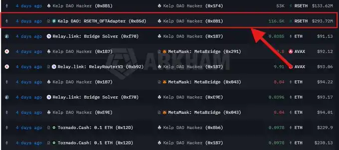 一個獨立的攻擊發起錢包(0x4966…575e)調用了 LayerZero EndpointV2 合約上名為 lzReceive 的函數。由於驗證器已被成功欺騙,這次調用被視為合法的跨鏈消息。Kelp 的跨橋合約 Kelp DAO: RSETH_OFTAdapter(Etherscan 地址:0x85d…)隨即向 0x8B1 釋放了 116,500 枚 rsETH。